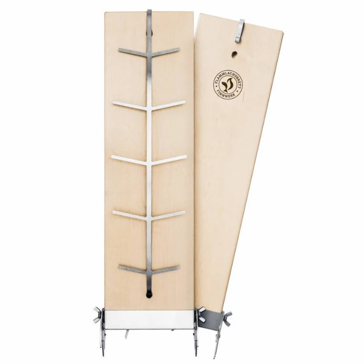 Traditioneel Fins bereide zalm is een rustieke en populaire manier om smakelijke zalm te bereiden bij het vuur. Onze rookplanken zijn gemaakt van massieve Noorse berk. Met behulp van het roestvrijstalen visgraat (uit één stuk gesneden, vaatwasmachinebestendig) kan de vis eenvoudig op de berkenplaat worden gemonteerd om op traditionele Finse wijze door het vuur te worden bereid. De meegeleverde houder wordt eenvoudig op de rand van de grill of de vuurschaal geplaatst. Vervolgens wordt de bereide rookplank in de houder geschoven en in de gewenste hoek gefixeerd. De vis wordt vervolgens op het bord blootgesteld aan de hitte van het vuur. Het duurt ongeveer 45-60 minuten voordat de vis kookt.