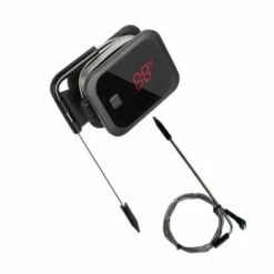 Inkbird IBT-2X, een rechthoekige thermometer met LCD-scherm. Je kunt 2 probes aansluiten zodat je twee gerechten tegelijk in de gaten kunt houden. Je krijgt een temperatuuralarm als de gewenste warmte is bereikt en er is een countdown-klokje voor beginnende BBQ’ers. Je kunt met deze thermometer tussen de 0 en 250 graden Celsius meten, met een nauwkeurigheid van plus en min 1°C.