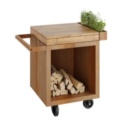 Onder het werkblad is het meubel voorzien van een houtopslagplaats waardoor u uw haardhout altijd dicht bij de hand heeft en niet onnodig op en neer hoeft te lopen. Praktisch is daarnaast ook de houder voor accessoires en specerijen. Ideaal voor het opbergen van bijvoorbeeld uw kookgerei.
